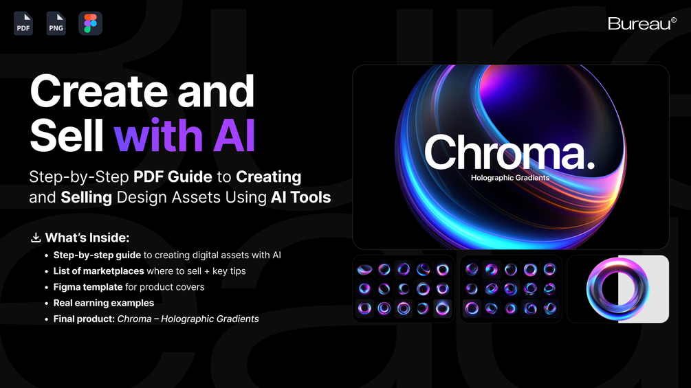 1 PDF Guide (20 pages), 1 Figma Template, 1 Final Pack (Chroma – Holographic Gradients)